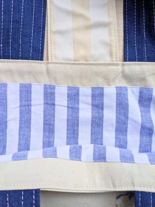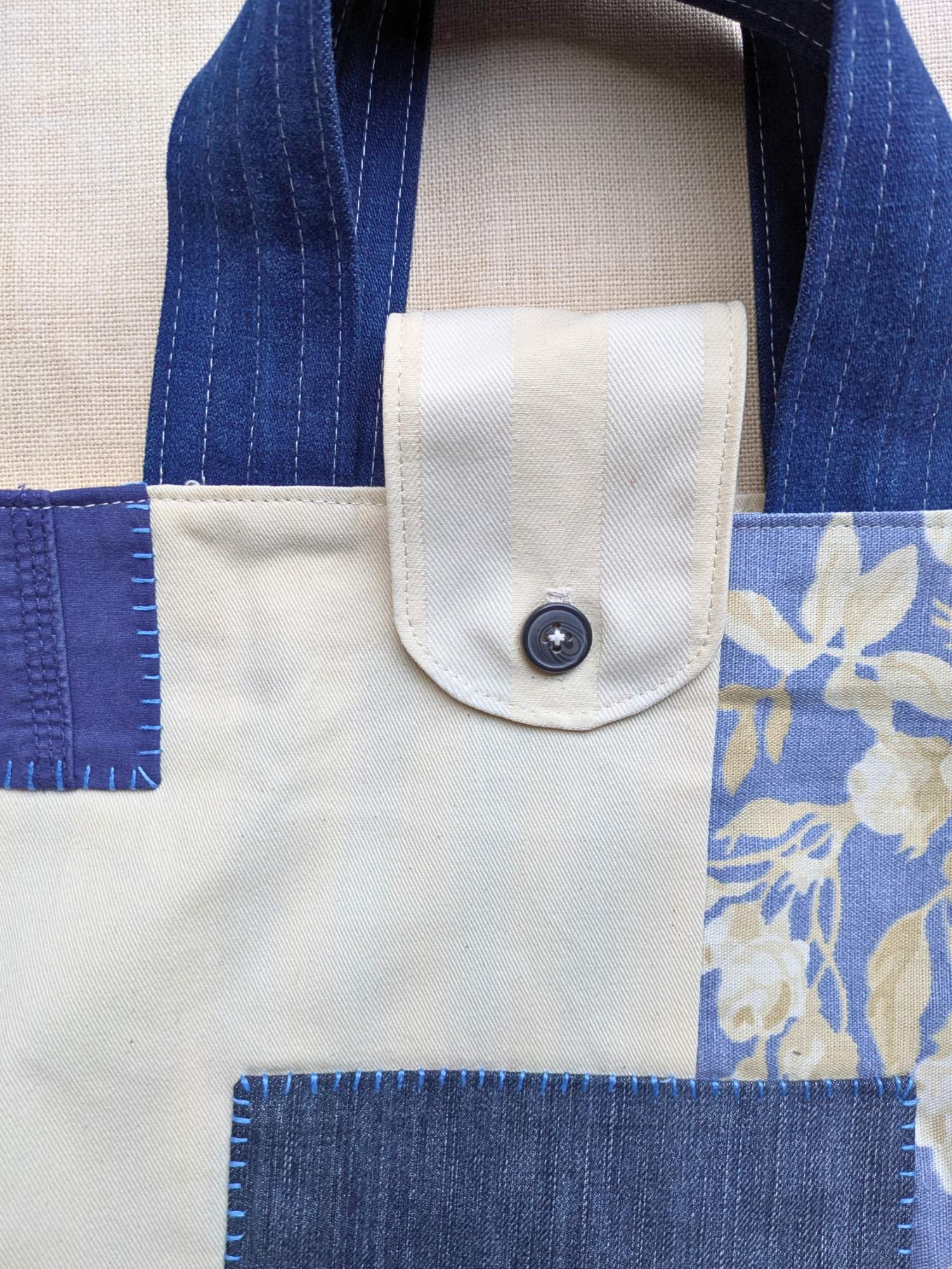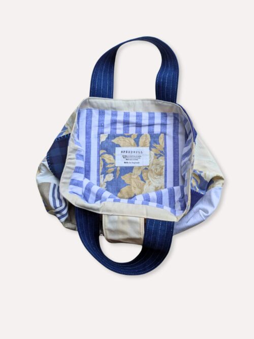 Handmade patchwork tote bag, crafted entirely from reclaimed fabrics