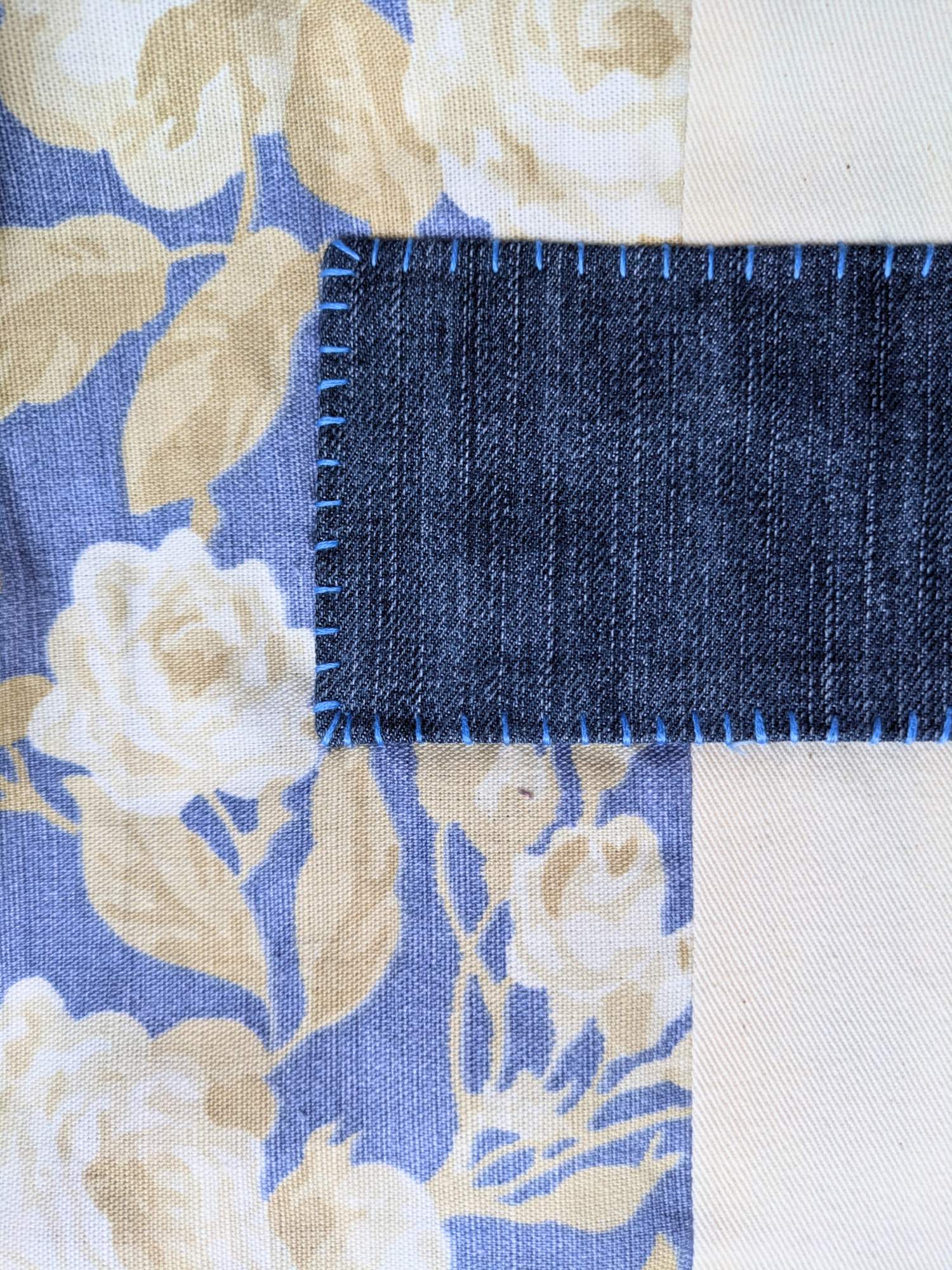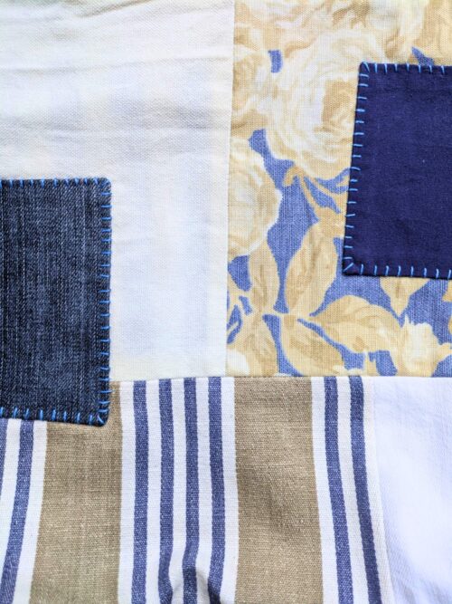 Patchwork made from denim, canvas, and cotton, with hand-stitched whip patches layered on the exterior